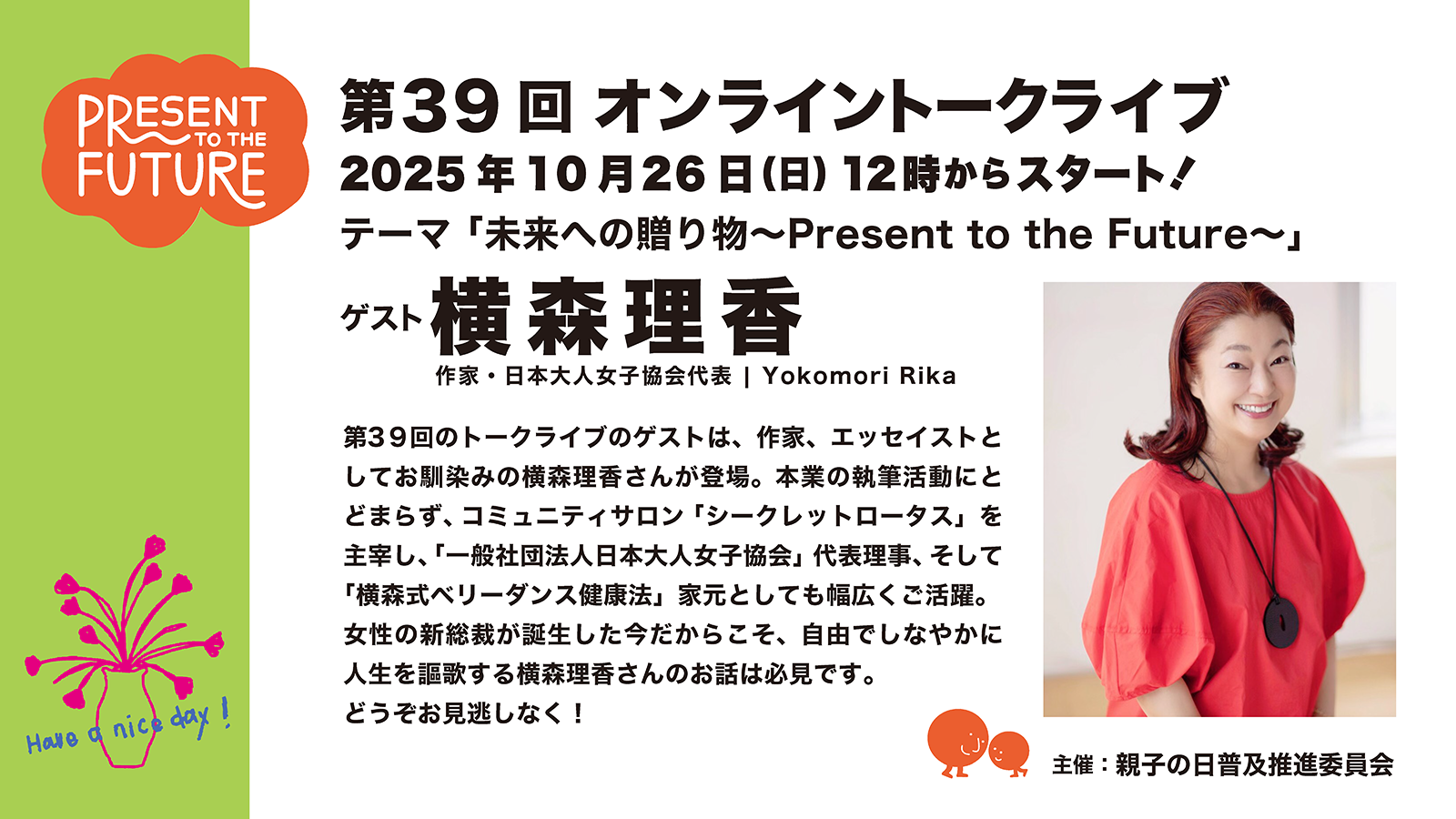 第39回「親子の日」オンライン・トークライブは、ゲストに作家の横森理香さんをお迎えします。女性の社会的活躍が注目される今、女性の感性を社会の中でどう活かし、“その人らしいリーダーシップ”を育んでいくためのヒントは??