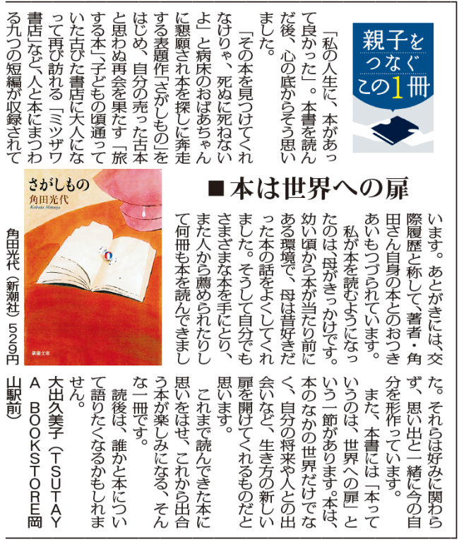 今月の一冊は、角田光代さんの「さがしもの」(新潮社)です。 この「さがしもの」は、表題作を含めて人と本にまつわる9つの 短編が収められています。 ご紹介くださったTSUTAYA BOOKSTORE岡山駅前にお勤めの 大出…