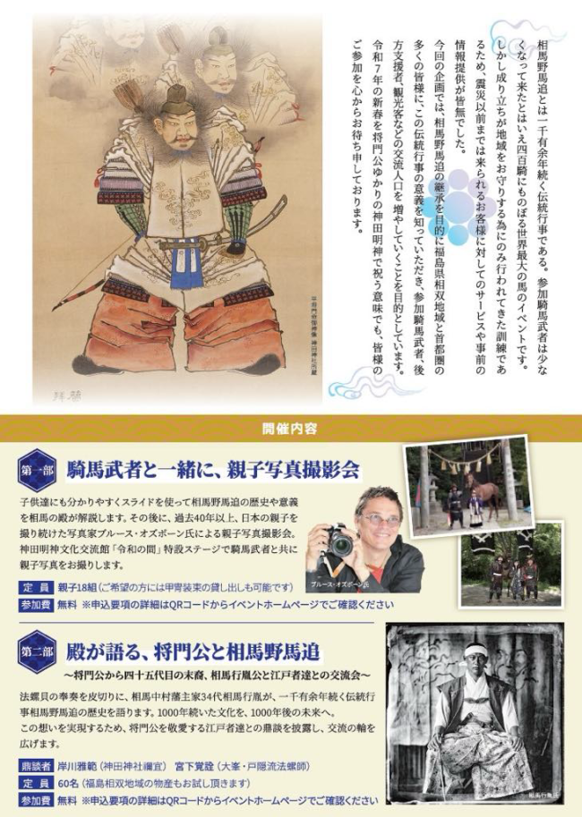 平将門ゆかりの神田明神で、相馬野馬追継承事業の一環として特定非営利活動法人相馬救援隊主催の親子写真撮影会を実施いたします。 同会場では当日、相馬馬追の歴史や祭りの意味などを相馬の殿様がお話ししてくださるイベントも実施しま…