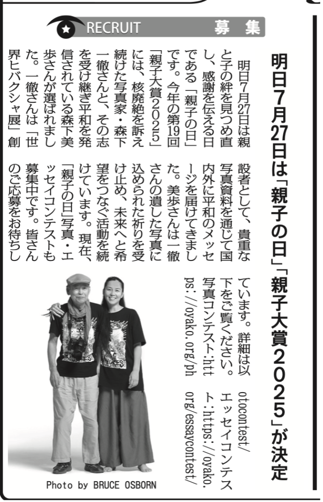 7月26日付の毎日新聞・夕刊にて、今年の「親子大賞」受賞者が紹介されました。 今年の「親子の日」は7月27日。 第19回となる「親子大賞」には、半世紀近くにわたり被爆者の姿を撮り続け、国内外で核廃絶を訴えてこられた写真家…