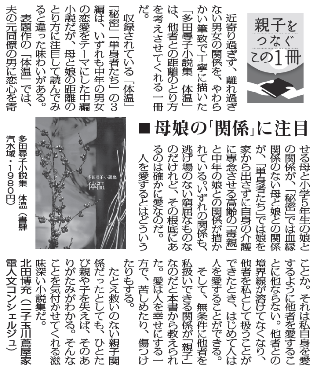 毎日新聞で毎月最初の月曜日の朝刊に掲載されている「親子をつなぐこの1冊」。 今月は「多田尋子小説集 体温」のご案内です。 こちらは歴代最多の六度、芥川賞の最終候補にあがった多田尋子さんの小説が 復刊された中…