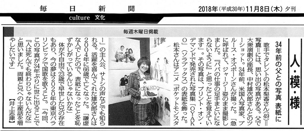 11月8日(木)の毎日新聞夕刊の「人・模・様」欄に、「 親子大賞2018 賞特別賞」受賞の松本梨香さんが紹介されました。