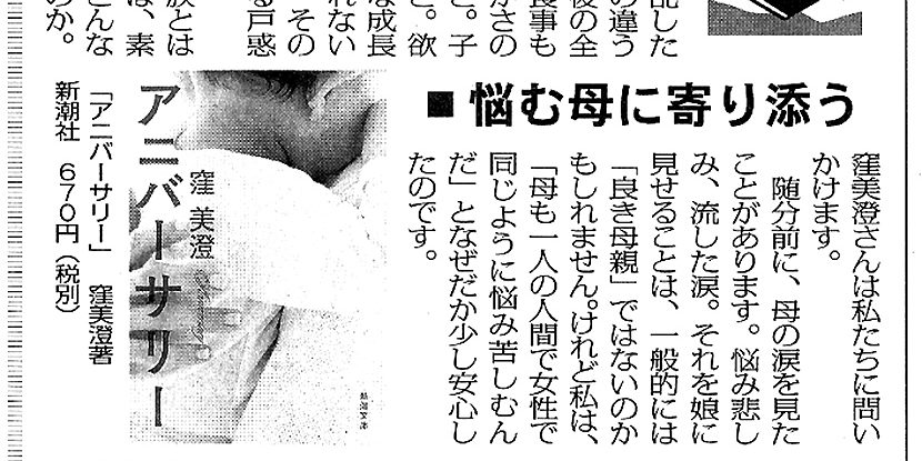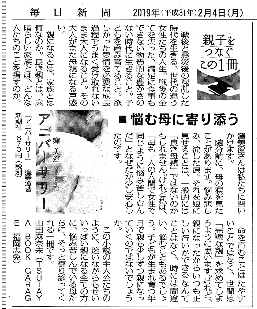2月192019お知らせ今月の一冊は、窪美澄さんの「アニバーサリー」です! 「親になるとは、家族とは、良き親とは何なのか。素晴らしい家族とは、どんな人たちのことを指すのか」と、迷いながら戸惑いながら少しづつ親になっていく。 悩む母に寄り添ってくれるこの一冊は、山田麻奈未(TSUTAYA BOOK GARAGE 福岡志免)さんから推薦していただきました。 ぜひお手にとってみて下さい。 Category: お知らせBy 親子の日 Press2019年2月19日Leave a commentTags: アニバーサリー毎日新聞窪美澄親子をつなぐこの1冊 Author: 親子の日 Press Post navigationPreviousPrevious post:Japan TimesNextNext post:InterFM897「Lazy Sunday」に出演のお知らせRelated Posts第41回 親子の日オンライン・トークライブのお知らせ2025年12月21日写真展のお知らせ2025年11月29日松本梨香 40周年記念特別公演『ナビゲーション2025』2025年9月11日『ラフ&ピース』、視聴者1名様にプレゼント2025年8月31日第37回オンライン トーク ライブ2025年8月24日第2回箱根芸術祭8月31日まで開催2025年8月16日