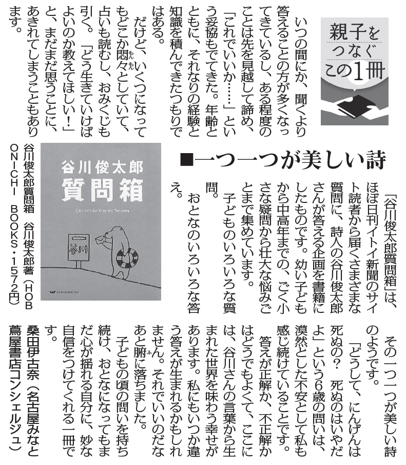 毎日新聞で毎月最初の月曜日の朝刊に掲載されている「親子をつなぐこの1冊」。