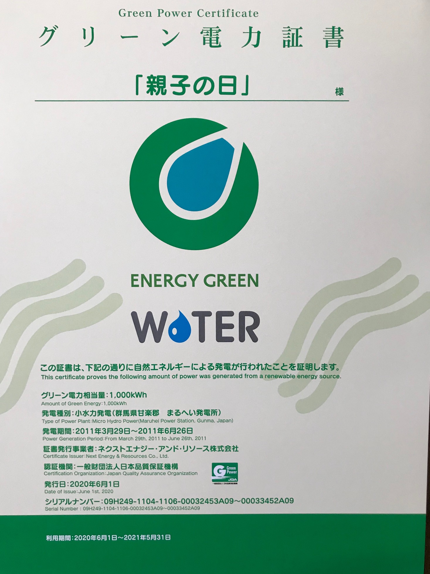 グリーン電力証書システムに、今年も「親子の日」は協力しています。