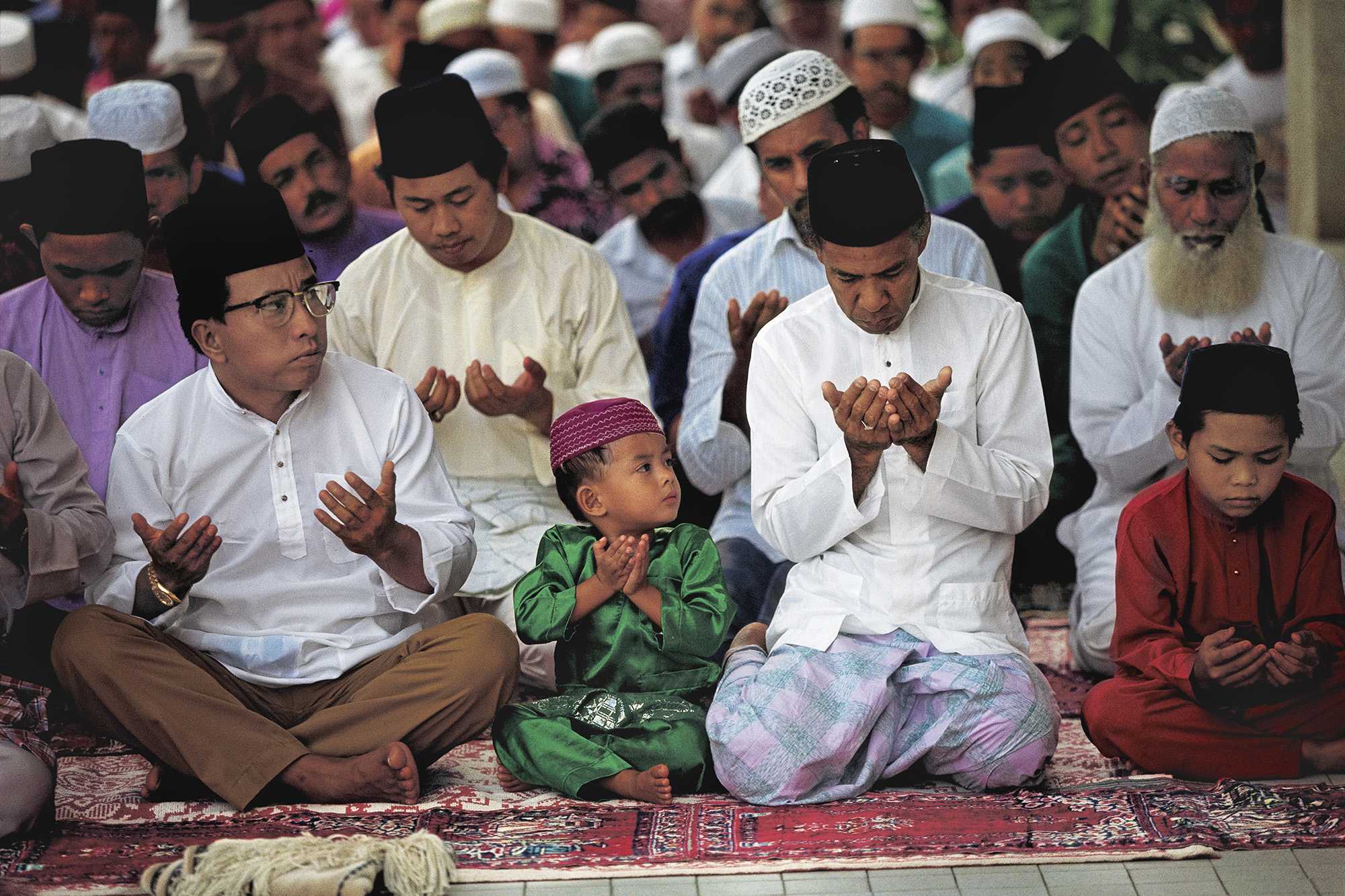 イスラム教徒にとって祈りと断食の月であるラマダンの最初の金曜日のできごと。 ラマダンでは犠牲について学び、恵まれない人々への思いやりや慈善の大切なこと教え寛大な生き方を学ぶという時。 ブルネイのバンダルスリブガワンにあるサイフディエンモスクで息子に祈り方を教える父親の姿に出会いました。 Michael Yamashita は1949年にカリフォルニア州サンフランシスコで生まれました。 大学を卒業後にしばらく日本に住んでいた時期もありましたが、1979年にナショナルジオグラフィックで働き始め、以来、ソマリア、スーダン、イングランド、アイルランド、パプアニューギニア、イラク、アフガニスタン、イランなど、さまざまな場所を旅して撮影。数々の賞を得るに至りました。 Michael Yamashitaが取材した写真作品の多くは「ナショナルジオグラフィック」誌に紹介されています。