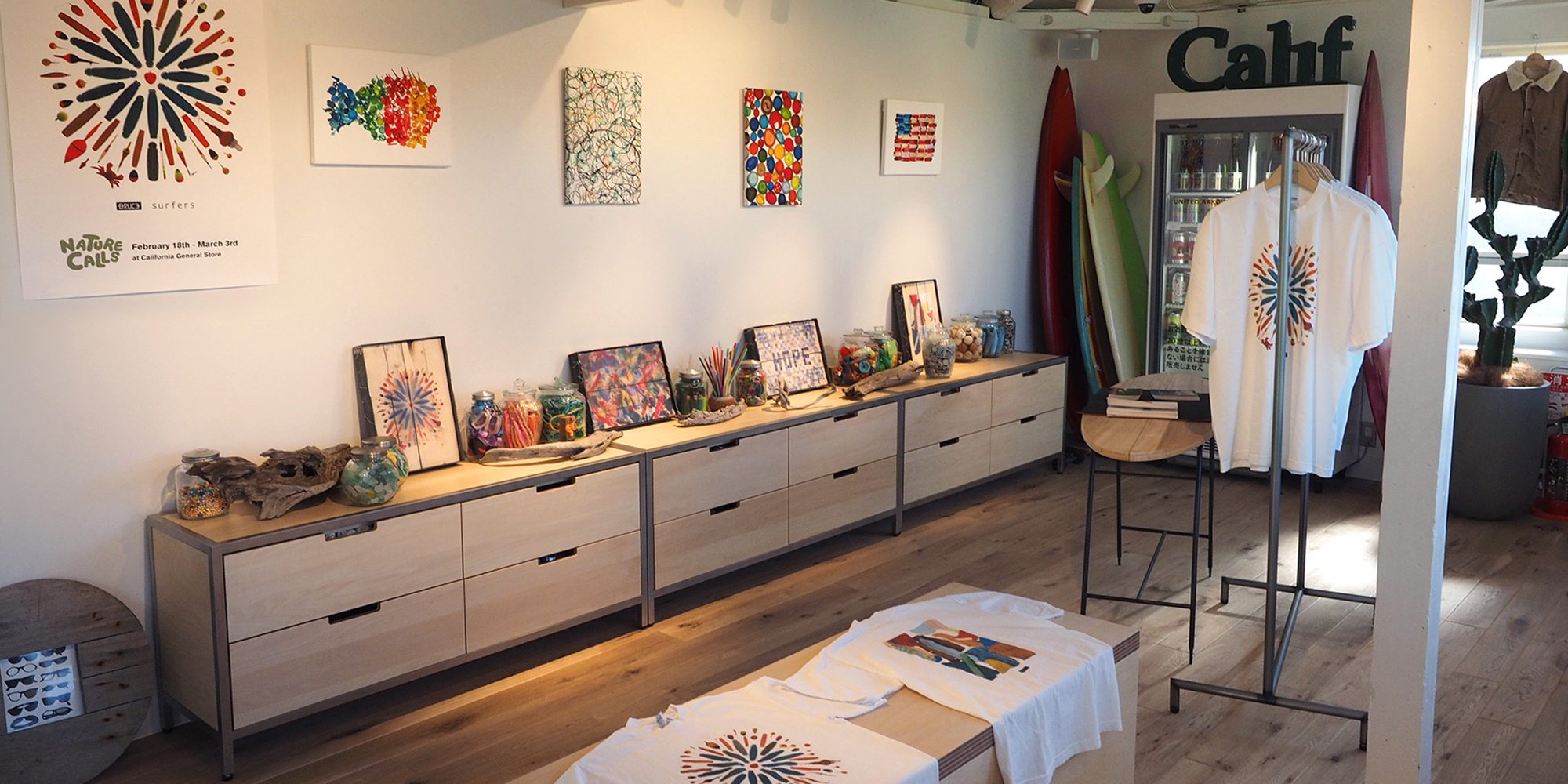 神奈川県にある江ノ島水族館に近いCalifornia General Store はUNITED ARROWSのブランドのひとつ。ブルース・オズボーンの写真をプリントしたTシャツの展示会が、3月3日まで行われています。写真のモチーフになっているは、ブルースがビーチで拾い集めたプラごみ、ライター、タイルなど。不要になって捨てられたプラスティックなどが写真として蘇っています。プラスティックには罪がない!!反省するべきは私たち人類だということを、この展示会で感じ取っていただけたら嬉しいです。会場には、ビーチで拾ったオブジェ(ゴミ)も一緒に展示しています。