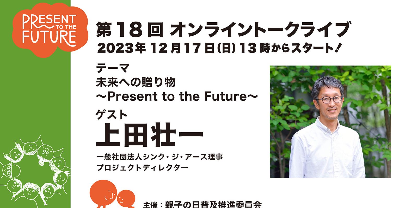 第18回目のオンライントークライブのゲストは、一般社団法人シンク・ジ・アース理事であり、社会・環境課題にクリエイティブに取り組むプロジェクトディレクターとして長年活動を続ける上田壮一さんをお迎えします。進行は、編集者でプロデューサーの関智が担当。写真家のブルース・オズボーンと、親子の日普及推進委員会代表の井上佳子も登壇いたします。