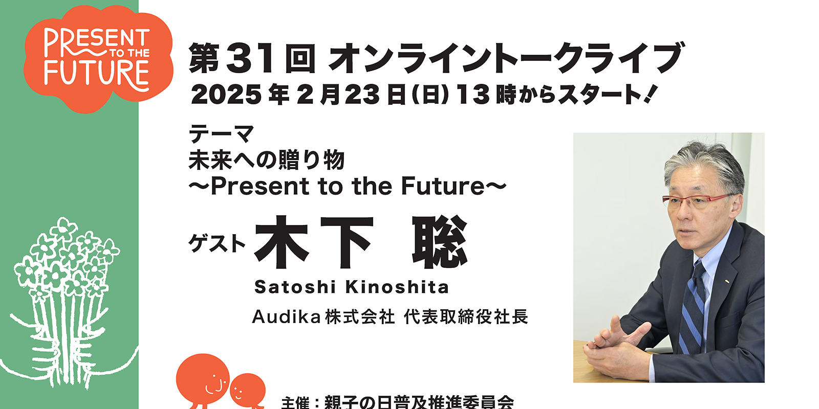 第31回目のオンライントークライブのゲストは、Audika 株式会社 代表取締役の木下 聡社長をお迎えします。進行は、編集者でプロデューサーの関智が担当。写真家のブルース・オズボーンと、親子の日普及推進委員会代表の井上佳子も登壇いたします。