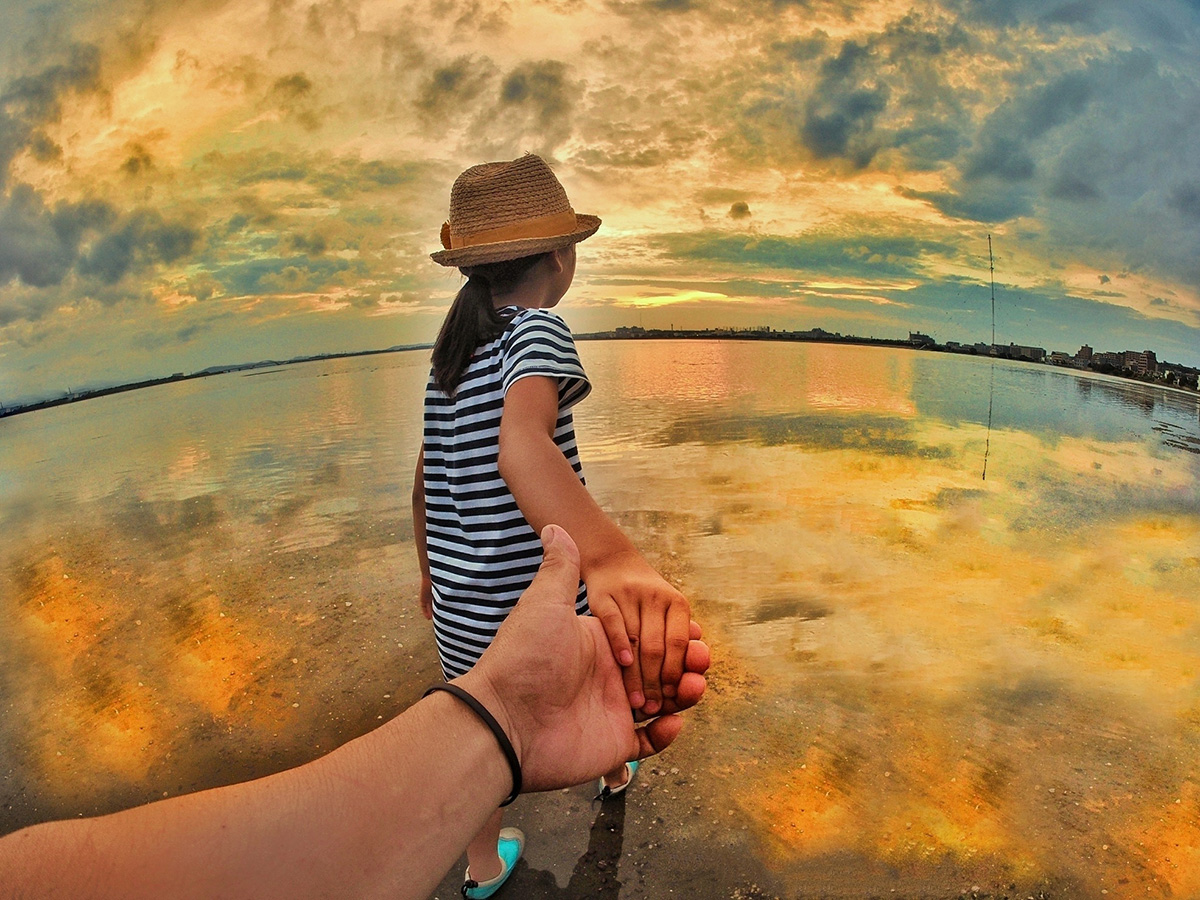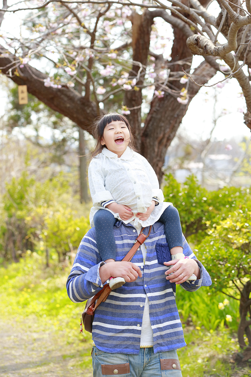 肩車してくれた父の顔をワンピースで隠す娘。イタズラな笑みが、幸せを感じる一枚です。