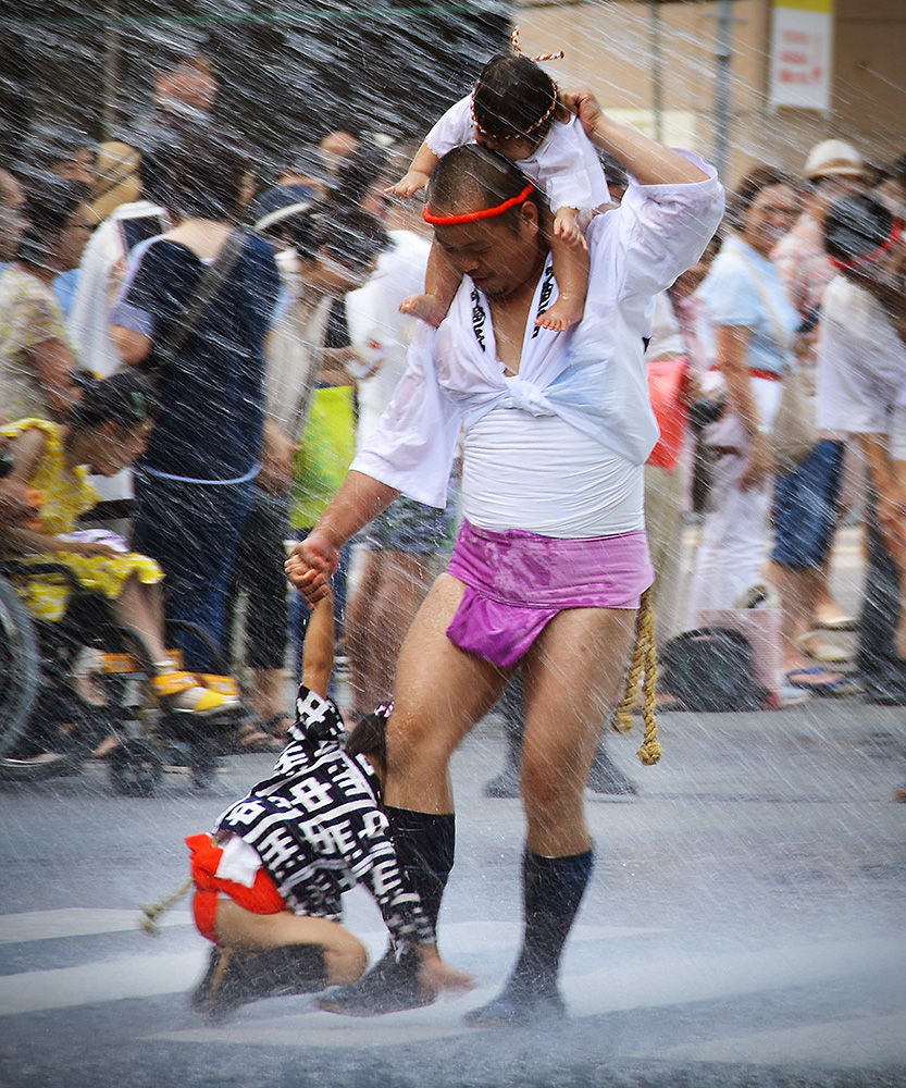 博多山笠片手は肩にに担いだ子を支え、足下はきおい水に倒れ込む子を片手で支える姿はまさに父子愛承諾あり