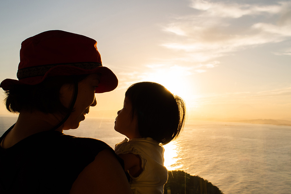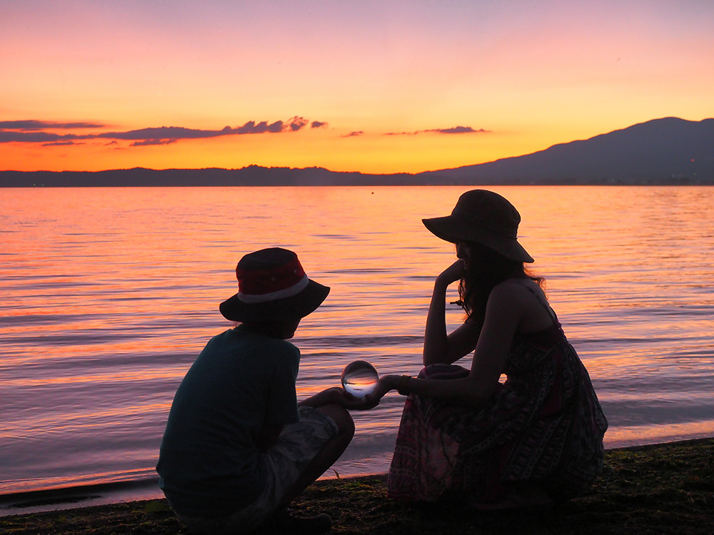 水晶玉の中に写した夕焼けを嬉しそうに眺める娘と孫を撮影しました。