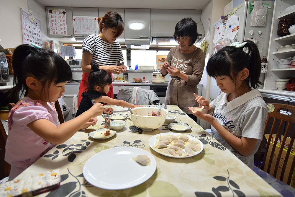 親子3代で力を合わせて餃子作り。女家系なので、こういう時はあっという間にたくさんの餃子が出来上がります。みんなで作ると楽しくておいしいね。
