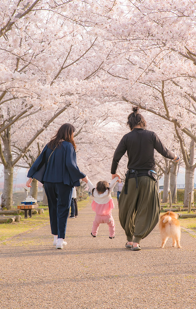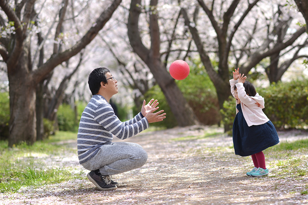 桜の下でお父さんとボール遊び。娘は上手に投げられたのがうれしくて、何度もお父さんに向かってボールを投げていました。