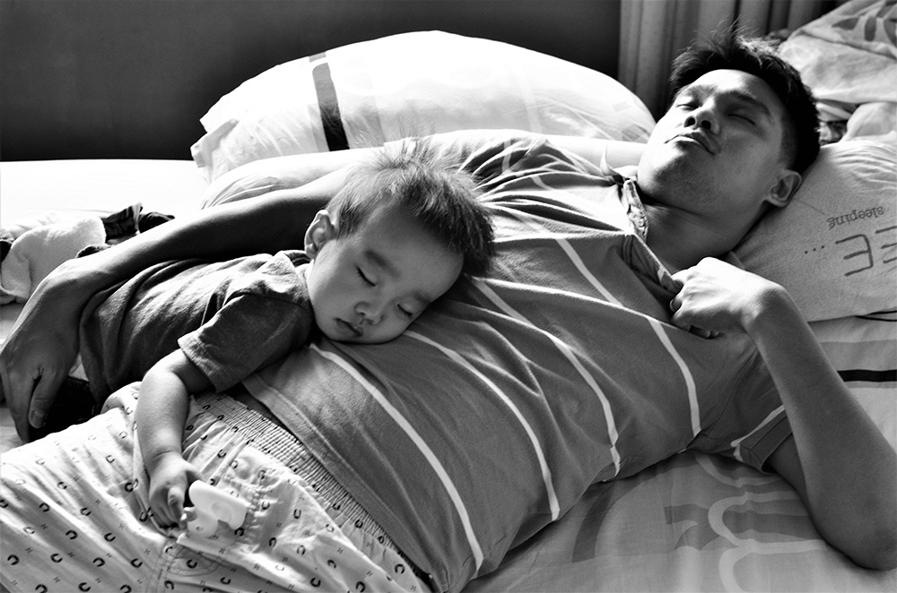一緒に遊んでいるうちに、2人とも寝てしまいました。父ちゃんの大きな体の温もりが大好きな息子と、息子の体重も気にせず爆睡できる夫です。