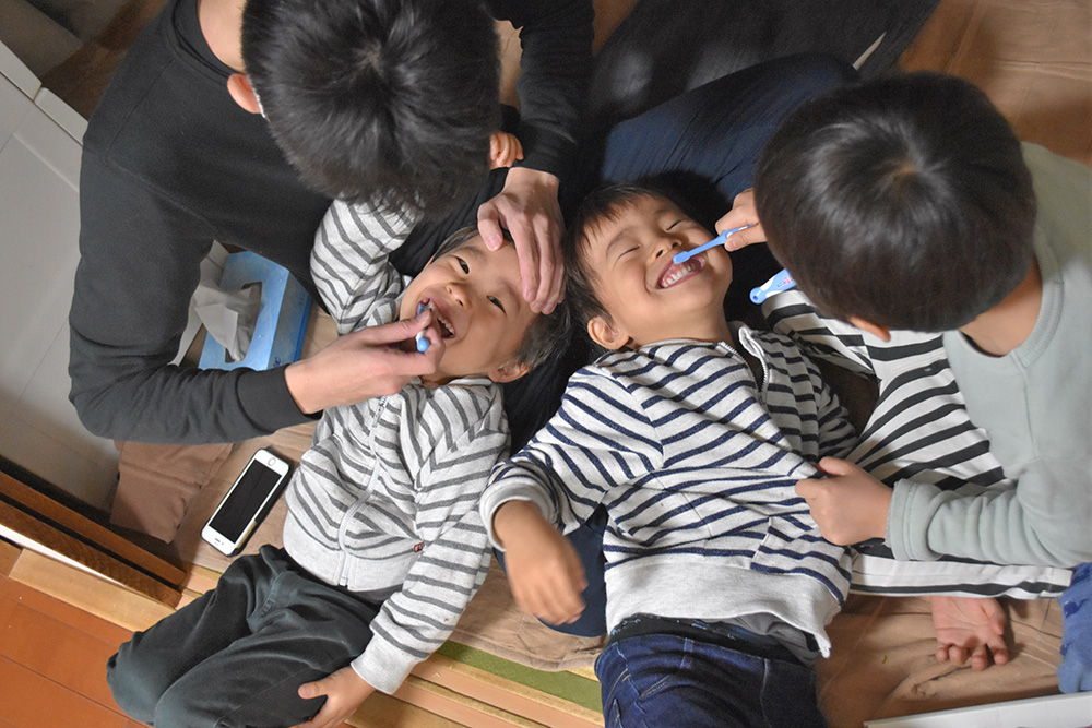 ハミガキの仕上げ磨きをお父さんにしてもらおうと双子が膝の取合い。2人同時は無理だから、お兄ちゃんがお父さんの代わりに磨いてくれて喧嘩にならず、むしろ逆に楽しい歯磨きになりました。