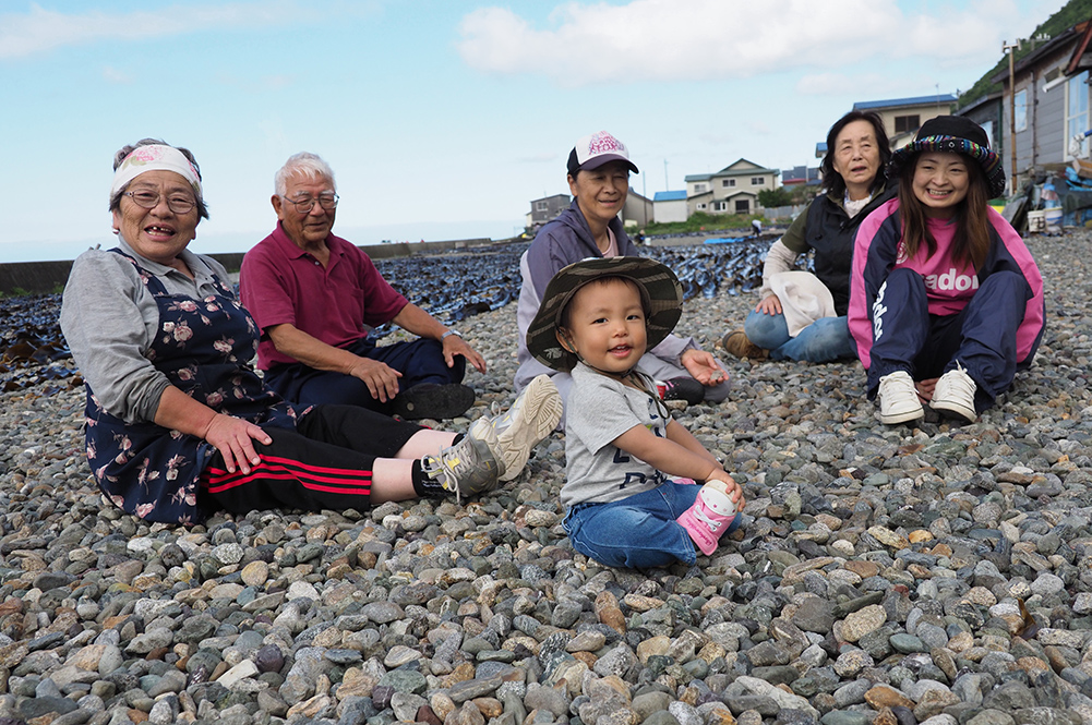 昆布干しは、子どもから大人まで家族総出で昆布を広げて干していく。この日は1歳の孫も初参加、親子三世代の記念に撮りました。