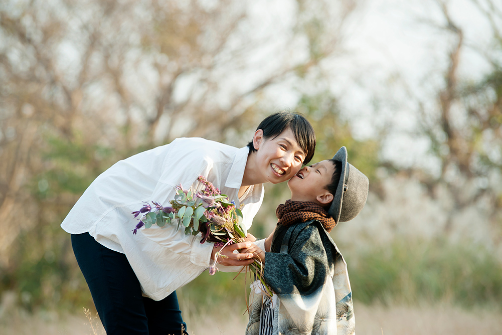 サプライズでママにお花のプレゼント。七五三撮影時の1幕。