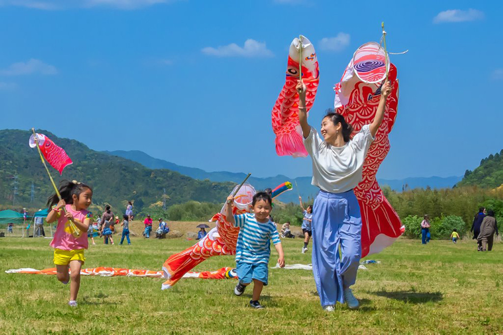 川敷に鯉のぼりと遊べるコーナーがありました。親子の楽しそうな一コマです。