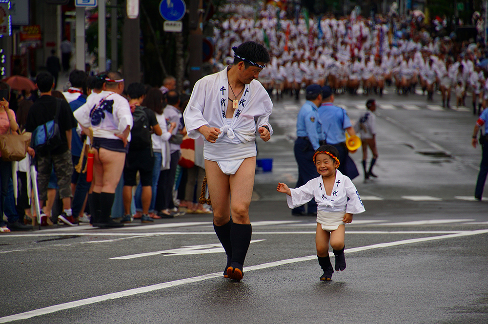 博多山笠での一コマです。こんなふうに親から鍛えられて一人前の祭りの男衆になって行くのです。