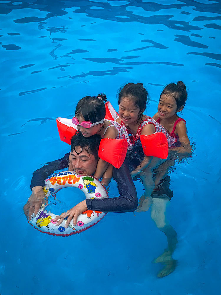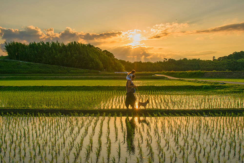 近所のあぜ道に虫取りに散歩に来た時にパパの肩車が大好きな娘とあぜ道を散歩する家族の姿をとらえました。