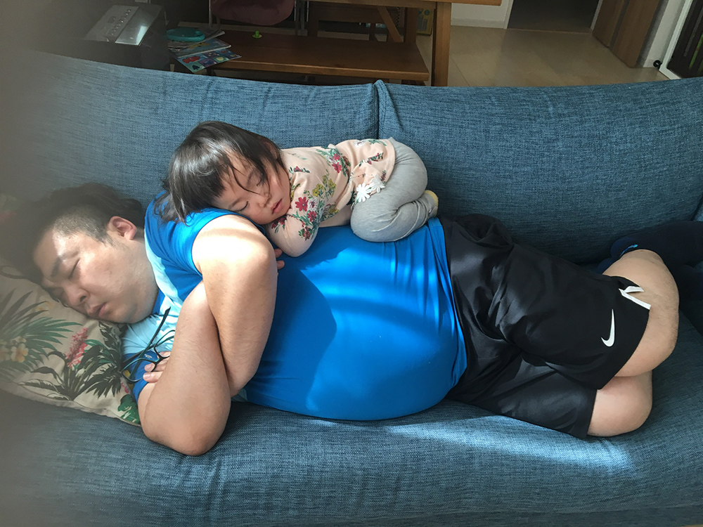 パパの上に娘がちょこんと同じ格好で寝ていて思わず笑ってしまいました。