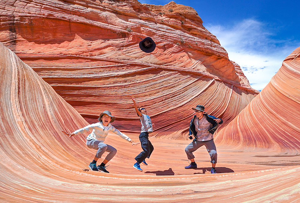 念願だったザ・ウェーブへ小学生2人を連れての長旅。その夢が叶った1枚。