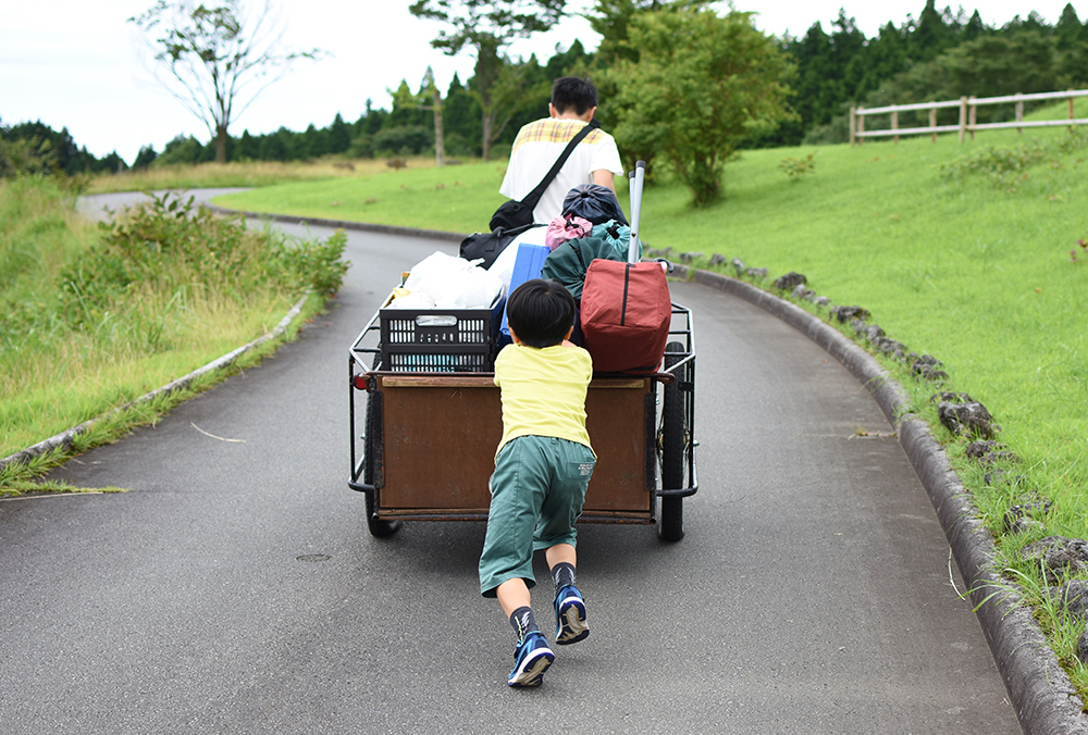 上り坂はパパと息子、ふたりで力を合わせてキャンプの荷物を運んでいました。