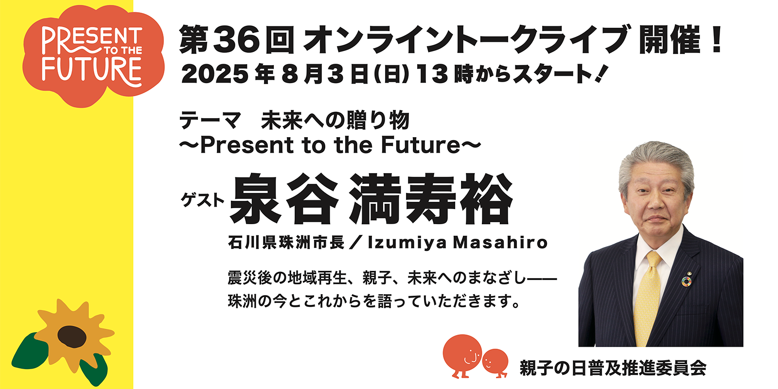 第36回となる今回のトークライブでは、2024年1月に発生した能登半島地震により甚大な被害を受けた石川県珠洲市において、復興の先頭に立ち続けている珠洲市長・泉谷満寿裕(いずみやますひろ)氏をお迎えします。泉谷氏は石川県珠洲市のご出身。1987年に早稲田大学政治経済学部政治学科を卒業後、野村證券株式会社に入社。1995年に退社し、地元に戻って家業である「泉谷菓子舗」に加わり、2003年に代表に就任されました。2006年には珠洲市長に初当選。現在は5期目を務めておられます。政治・経済・地域産業にわたる幅広い知見をもとに、地域経済の再生と住民の暮らしを支えるまちづくりを一貫して推進してこられた泉谷市長。その姿は、被災地・珠洲市の人々にとって、未来を切り拓く大きな希望です。