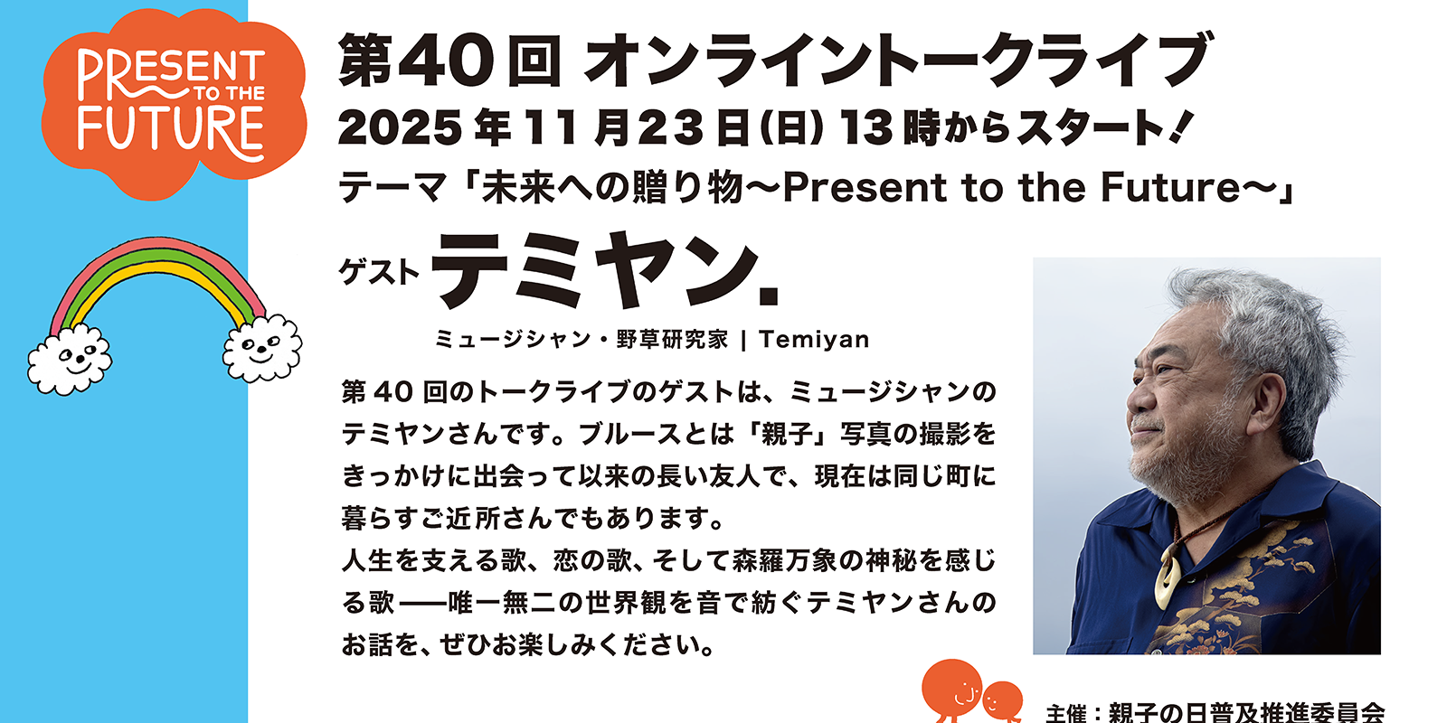 第40回のトークライブのゲストは、ミュージシャンのテミヤンさんです。ブルースとは「親子」写真の撮影をきっかけに出会って以来の長い友人で、現在は同じ町に暮らすご近所さんでもあります。人生を支える歌、恋の歌、そして森羅万象の神を感じる歌一唯一無二の世界観を音で紡ぐテミヤンさんのお話を、ぜひお楽しみください。